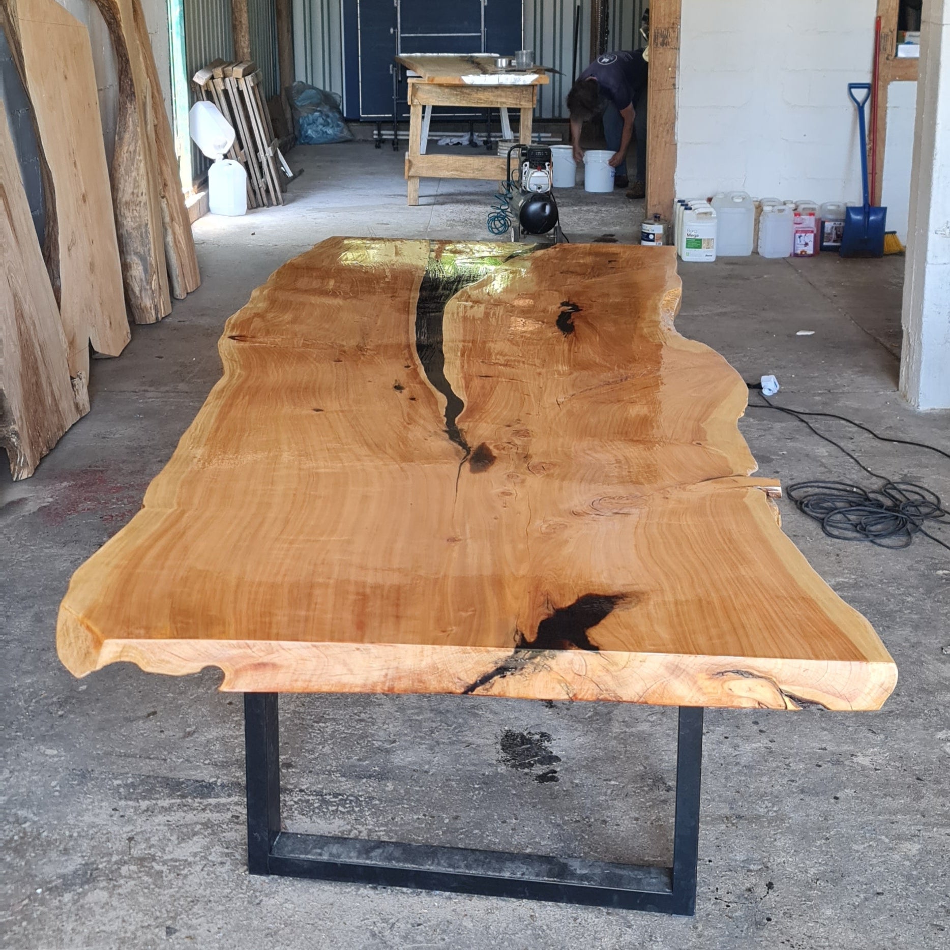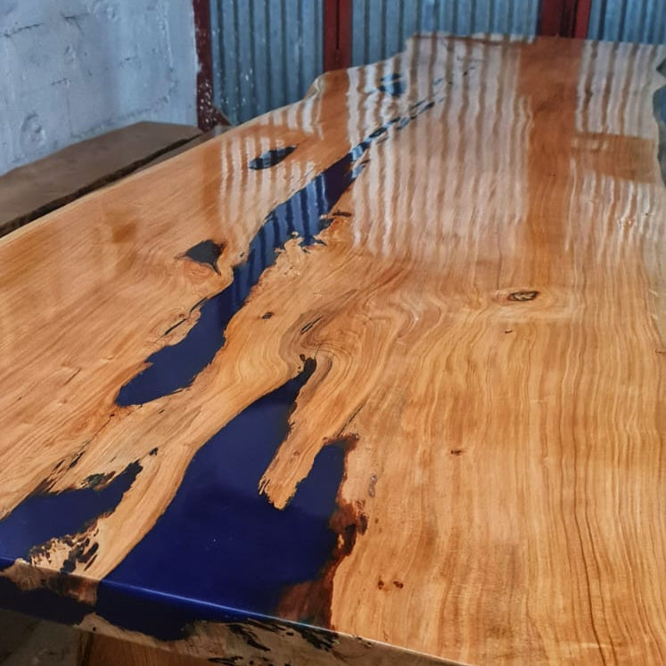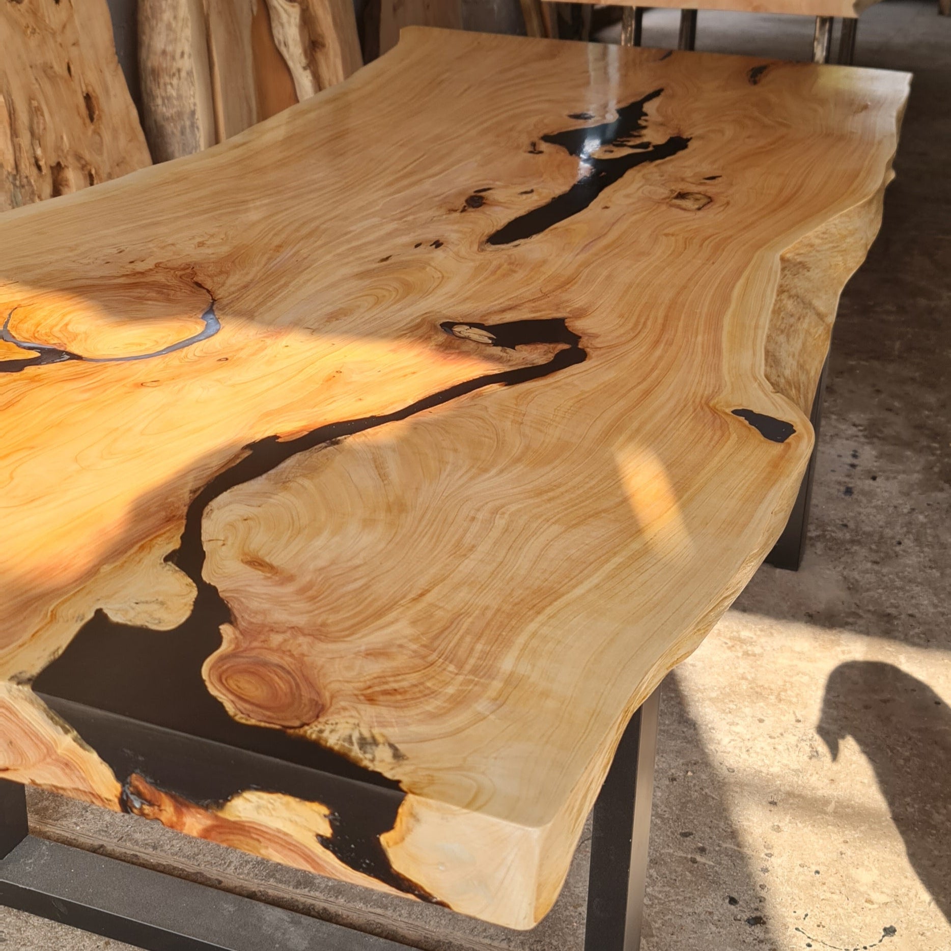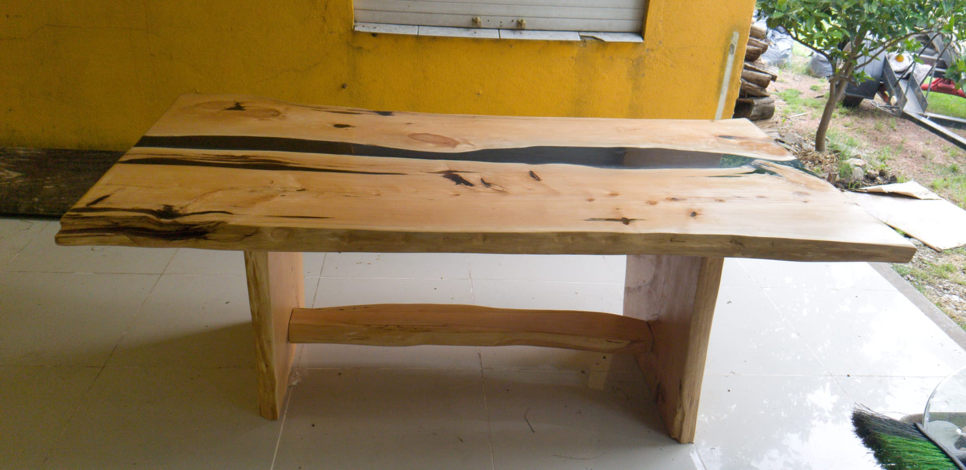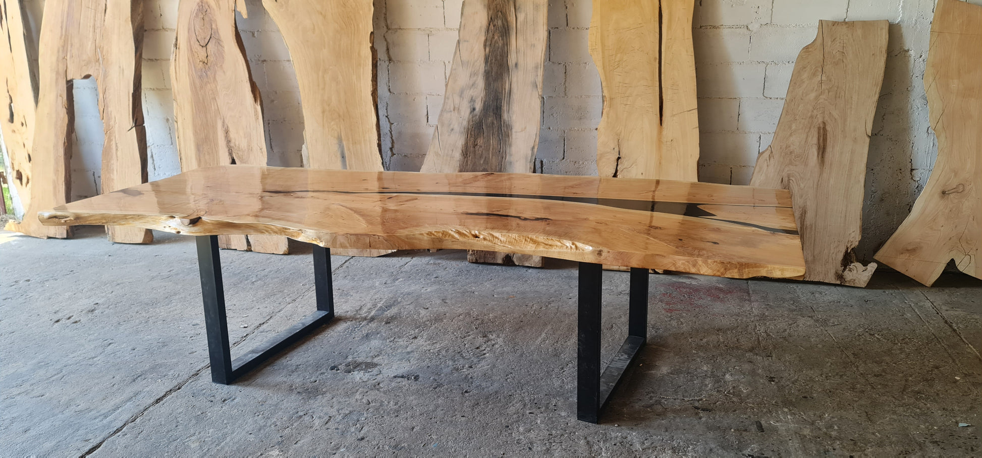 Madera de una sola pieza con río de resina (color a elección). Una fusión de materiales que resalta lo natural con lo moderno.