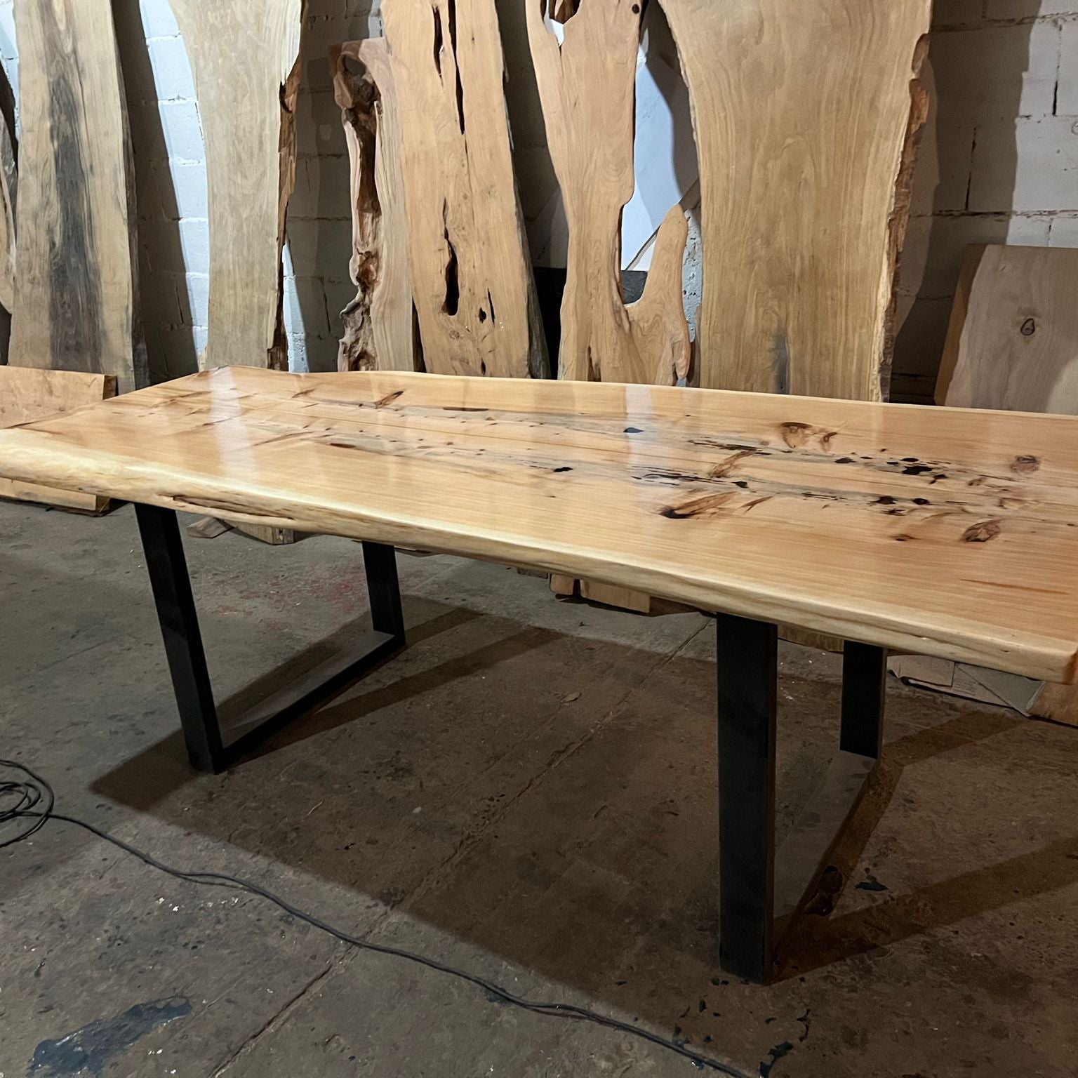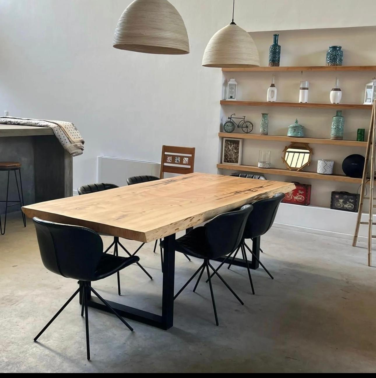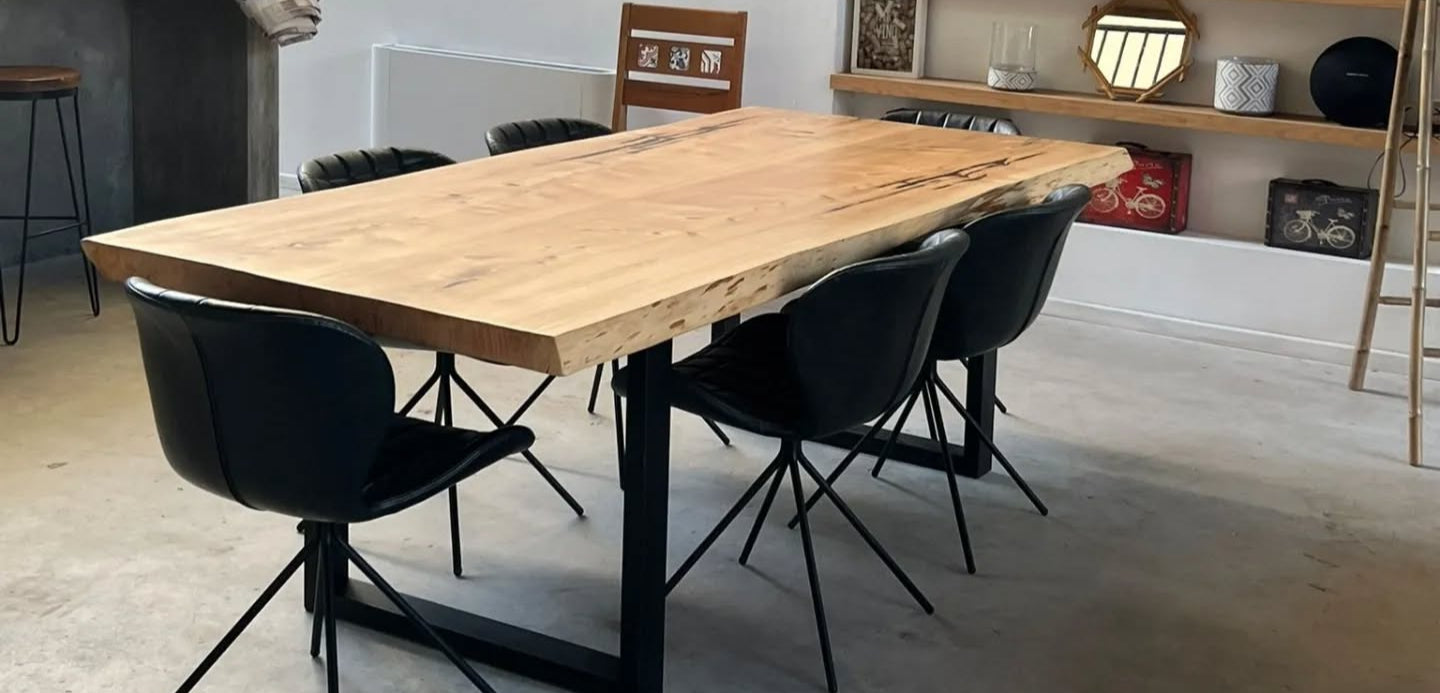 Nuestra Mesa Multi Slab combina una base de hierro artesanal con una superficie de tablones ensamblados, conservando la belleza natural de la madera maciza.